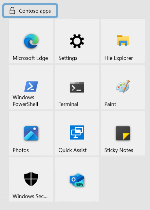 A partial Start layout enables you to add one or more customized tile groups to users' Start screens or menus, while still allowing users to make changes to other parts of the Start layout. All groups that you add are locked, meaning users can't change the contents of those tile groups, however users can change the location of those groups. Locked groups are identified with an icon, as shown in the following image.