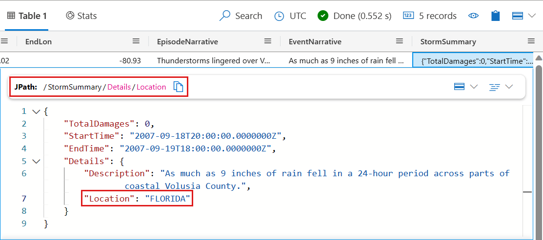 Locationcampo, annidato nelDetailscampo all'interno dell'oggetto property-bag dinamico dellaStormSummarycolonna.Selezionare l'icona a destra di JPATH per copiarla. Quindi, incollare e usare JPATH come filtro o condividerlo con altri utenti.