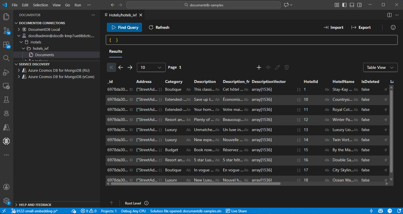 .envfile nella radice del progetto per le variabili di ambiente:# Identity for local developer authentication with Azure CLI AZURE_TOKEN_CREDENTIALS=AzureCliCredential # Azure OpenAI Embedding Settings AZURE_OPENAI_EMBEDDING_MODEL=text-embedding-3-small AZURE_OPENAI_EMBEDDING_API_VERSION=2023-05-15 AZURE_OPENAI_EMBEDDING_ENDPOINT= EMBEDDING_SIZE_BATCH=16 # MongoDB configuration MONGO_CLUSTER_NAME= # Data file DATA_FILE_WITH_VECTORS=../data/Hotels_Vector.json FIELD_TO_EMBED=Description EMBEDDED_FIELD=DescriptionVector EMBEDDING_DIMENSIONS=1536 LOAD_SIZE_BATCH=100Sostituire i valori segnaposto nel