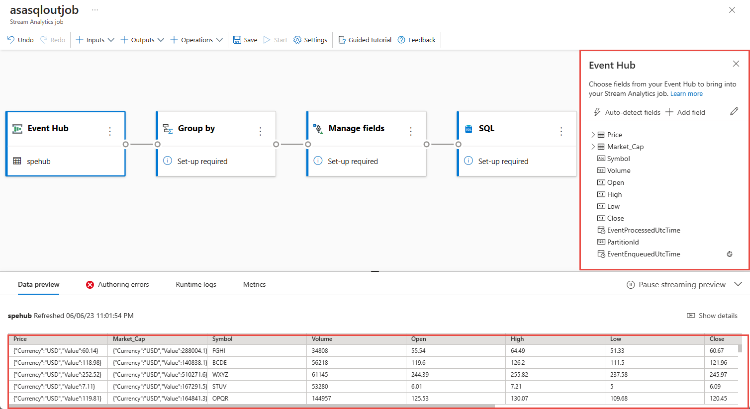 Esempio live di dati in ingresso nella tabella Anteprima dati nella vista diagramma. Viene aggiornato automaticamente periodicamente. È possibile selezionare Sospendi anteprima streaming per visualizzare una visualizzazione statica dei dati di input di esempio.