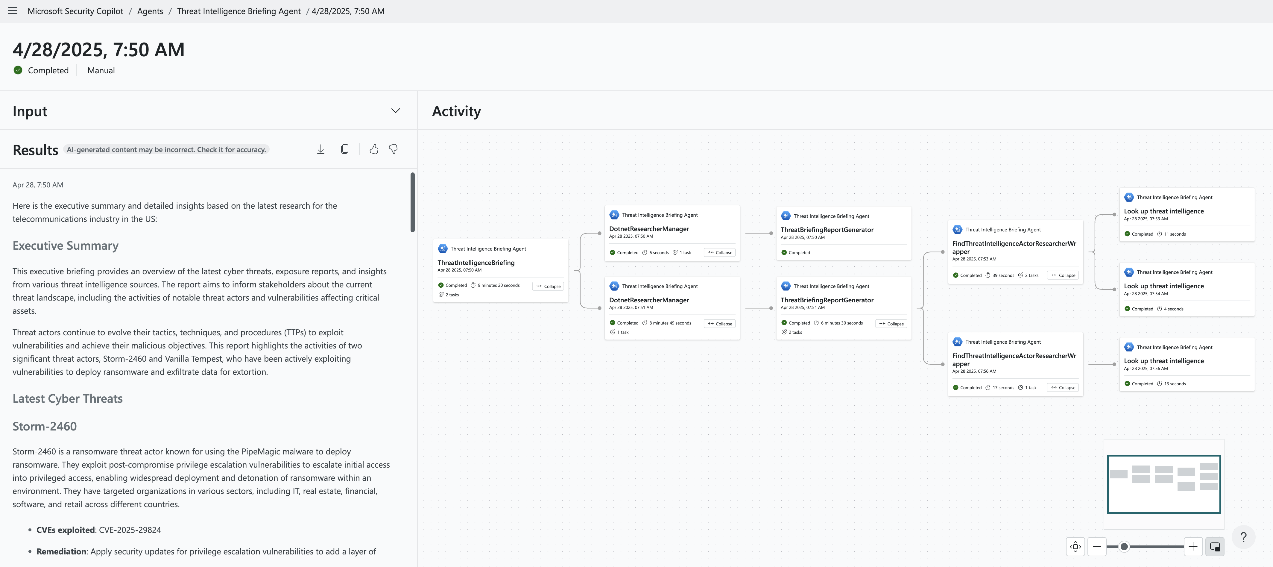 L'agente di intelligence per le minacce è stato sviluppato in risposta a questi punti deboli. L'agente di intelligence per le minacce nel portale autonomo di Microsoft Security Copilot genera briefing sulle informazioni sulle minacce in base all'attività più recente dell'attore di minacce e alle informazioni sulle vulnerabilità interne ed esterne, in pochi minuti. L'agente può aiutare i team di sicurezza a risparmiare tempo creando un report personalizzato e pertinente che fornisce ai CISO, ai responsabili della sicurezza e agli analisti una consapevolezza della situazione chiave e una solida base per il lavoro di difesa.