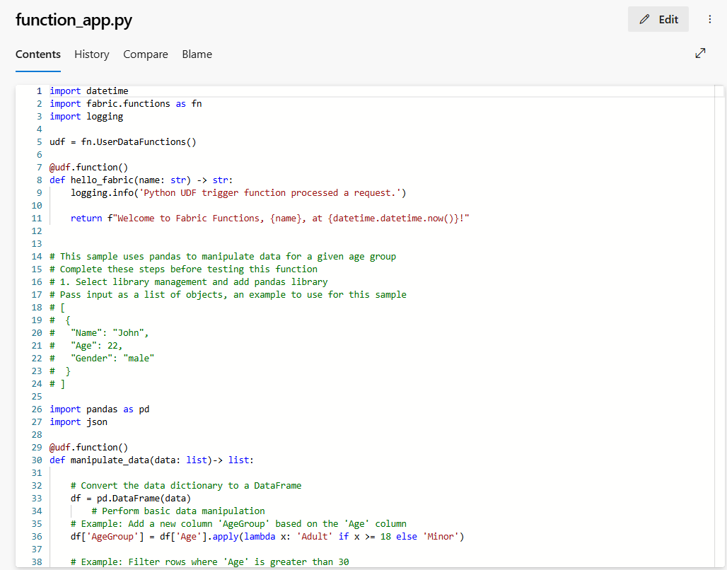 function-app.py: questo file è il codice delle funzioni. Tutte le modifiche apportate al codice apportato all'elemento delle funzioni dati utente vengono sincronizzate nel repository con questo file. È possibile eseguire varie operazioni Git per gestire il ciclo di sviluppo del codice.