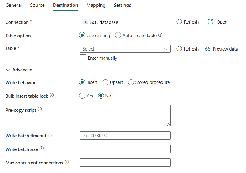 | dimensione del lotto di scrittura | Numero di righe da inserire nella tabella SQL per batch. Per impostazione predefinita, il servizio determina in modo dinamico le dimensioni del batch appropriate in base alle dimensioni della riga. |
