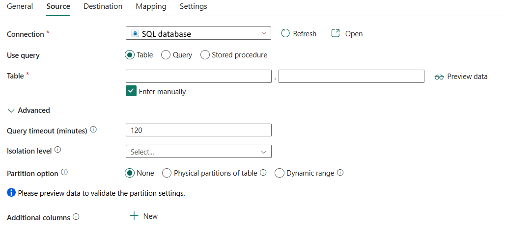 Opzione di partizionamento: Specificate le opzioni di partizionamento dei dati utilizzate per il caricamento dei dati dal database SQL. I valori consentiti sono: Nessuna (impostazione predefinita), Partizioni fisiche della tabellae Intervallo dinamico. Quando un'opzione di partizione è abilitata (ovvero non Nessuna), il grado di parallelismo per il caricamento simultaneo dei dati da un database SQL è controllato da Grado di parallelismo di copia nella scheda Impostazioni dell'attività di copia.