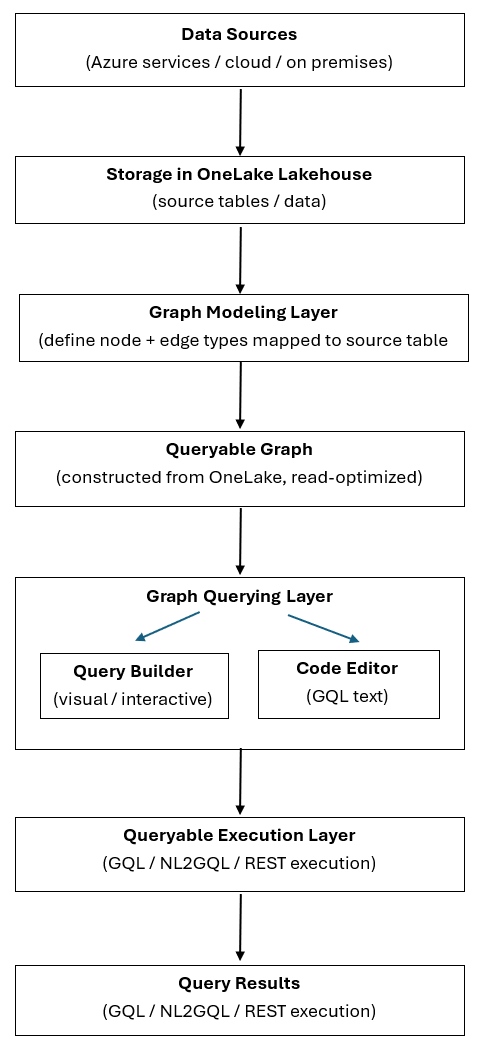 Graph in Microsoft Fabric trasforma i dati strutturati archiviati in OneLake in un grafo modellato e su cui è possibile eseguire query. È quindi possibile eseguire query sul grafico usando strumenti visivi o basati su GQL eseguiti tramite un motore comune per produrre risultati visivi, tabulari o programmatici.