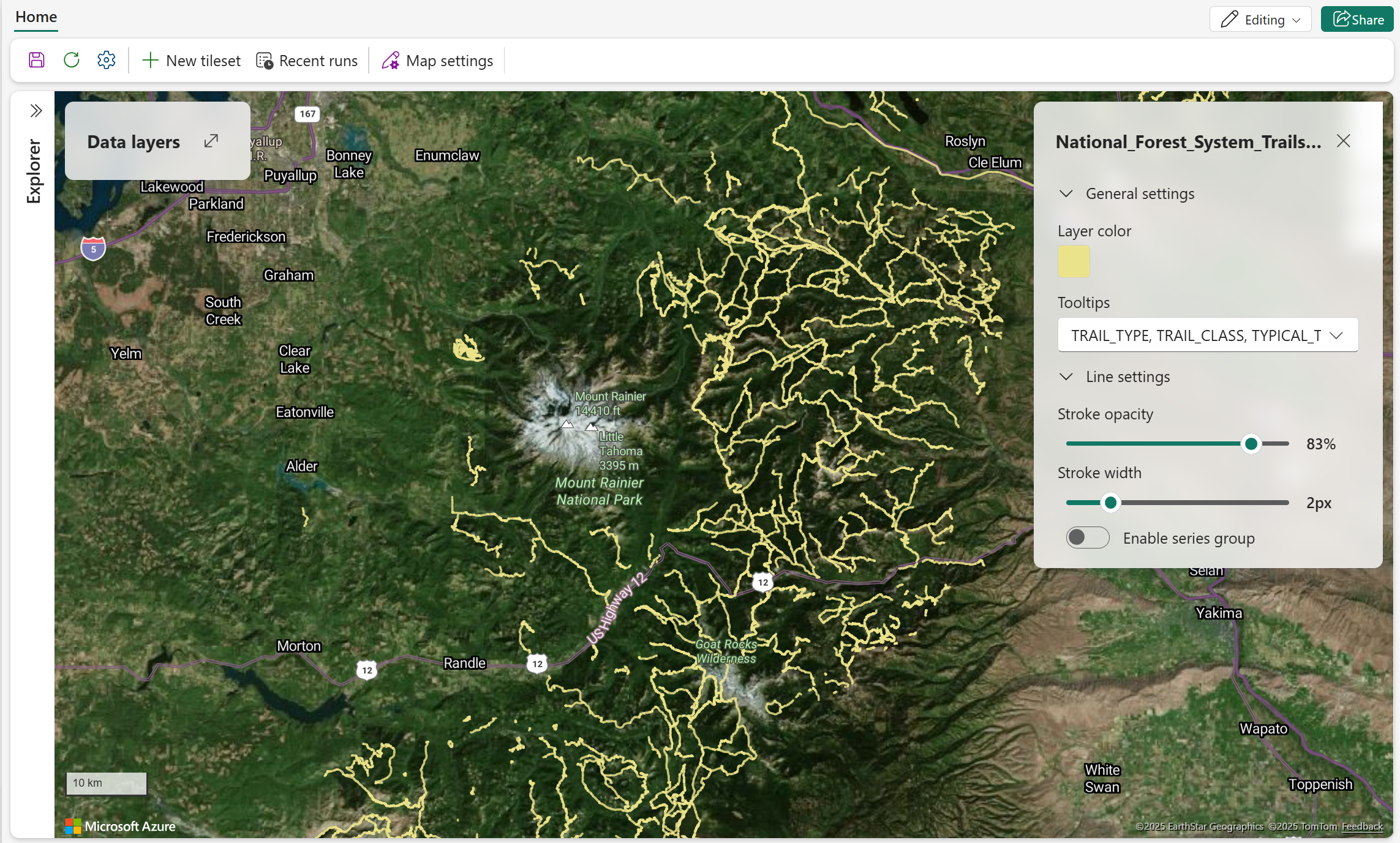 Lo screenshot seguente mostra i dati dei sentieri della foresta nazionale vicino al Monte Rainier. Abilitare il gruppo di serie e usare la proprietà ATV_RESTRICTED dei dati per identificare i percorsi vietati agli veicoli fuoristrada (ATV).