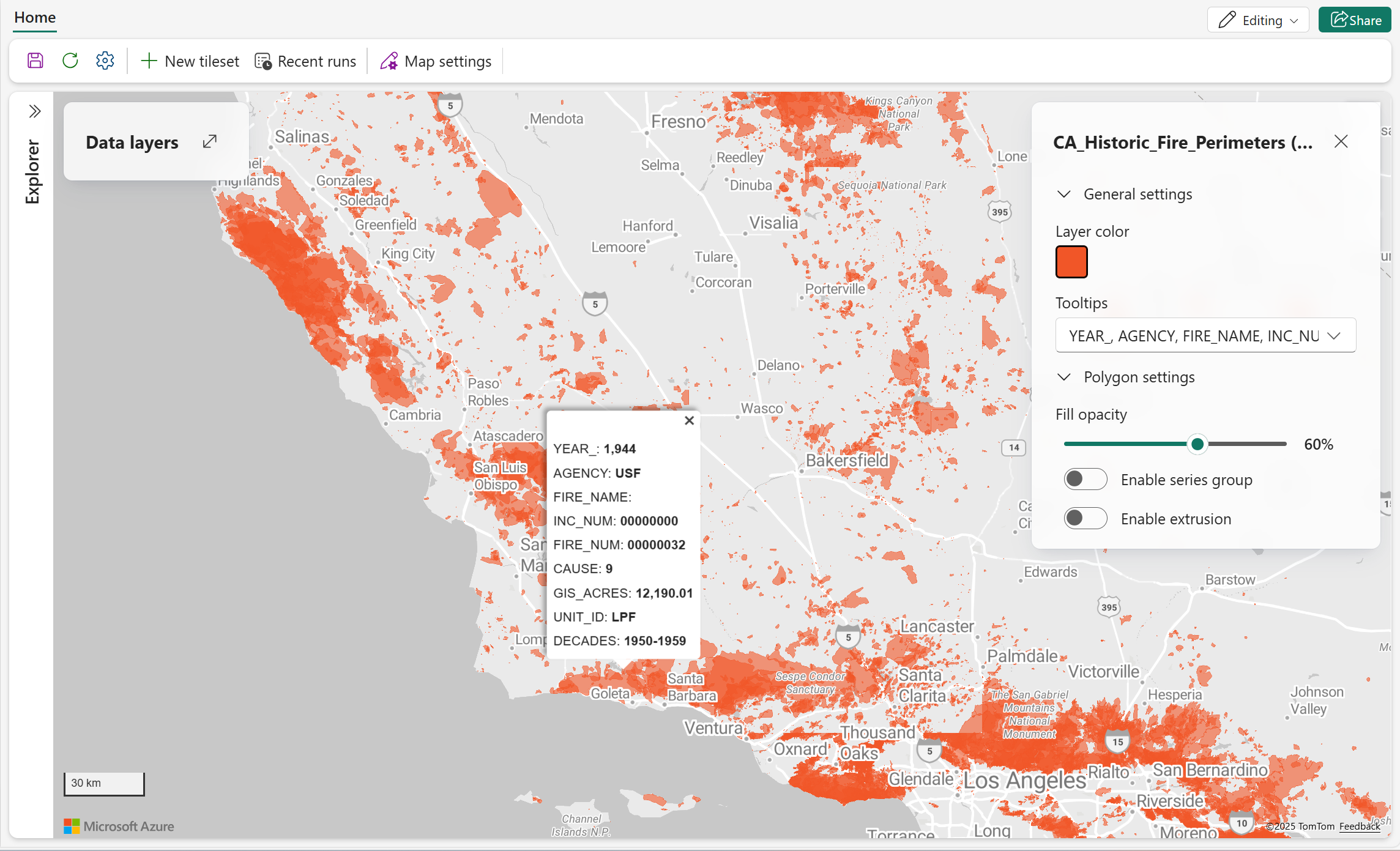 Lo screenshot seguente mostra una mappa cronologica dei perimetri antincendio della California, che mostra l'estensione geografica degli incendi precedenti usando poligoni rossi. Ogni poligono rappresenta un evento di incendio distinto e include metadati come l'anno, la causa e l'acreatura calcolata da GIS. Questa visualizzazione consente agli utenti di identificare rapidamente le aree soggette a incendi, analizzare i modelli cronologici di incendio e supportare la mitigazione degli incendi e la pianificazione della gestione del terreno.