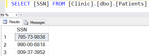 Supponendo che SSN sia una colonna char(11) crittografata nella tabella Patients, la query visualizzata di seguito restituirà i valori del testo in chiaro se Always Encrypted è abilitato per la connessione al database e se si ha accesso alla chiave master della colonna configurata per la colonna SSN.