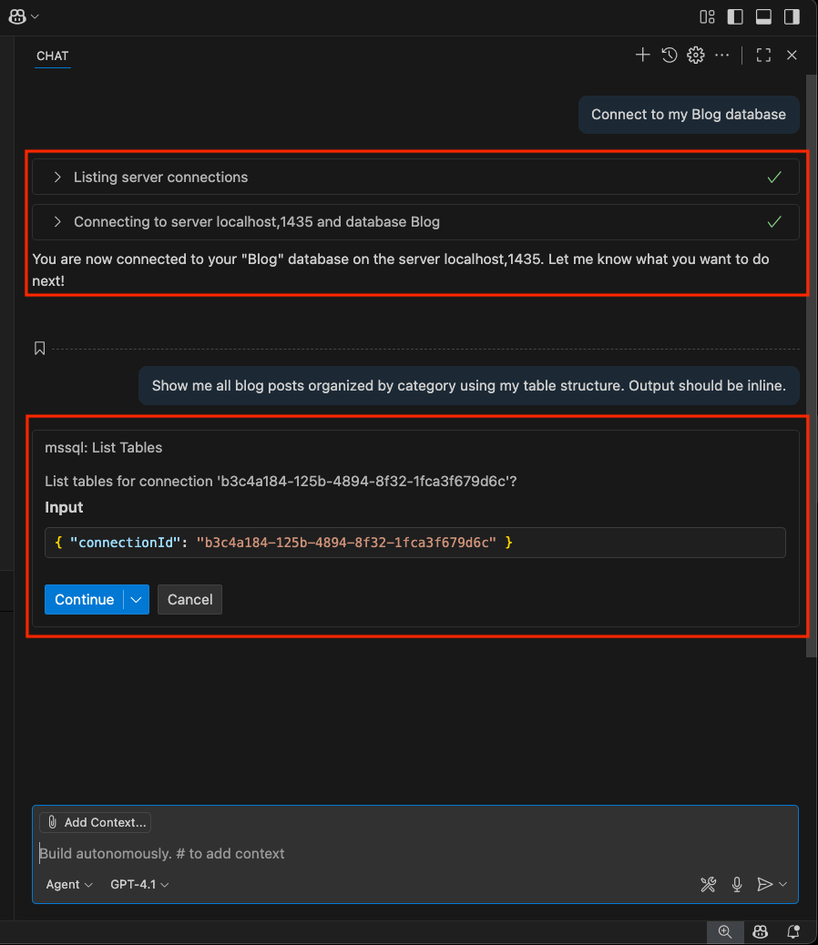 È anche possibile usare variabili di chat come #mssql_connect richiamare direttamente questi strumenti o scrivere richieste in linguaggio naturale, ad esempio: