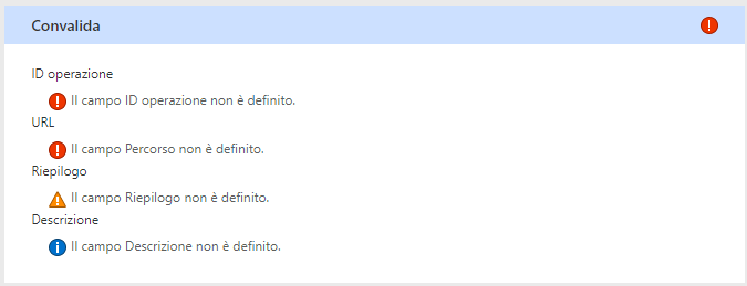 Va notato che, nelle immagini precedenti, i modelli di denominazione non sono coerenti, in quanto in alcuni casi i nomi nel riepilogo contengono spazi e in altri no. È possibile correggere l'errore aggiornando i campi nel portale oppure, se si è proprietari dell'API, è possibile chiedere allo sviluppatore di aggiornare gli elementi forniti nella definizione OpenAPI importata. Tenere presente che se si apportano modifiche manualmente nel portale e quindi si importa di nuovo la definizione OpenAPI, le modifiche verranno sovrascritte.