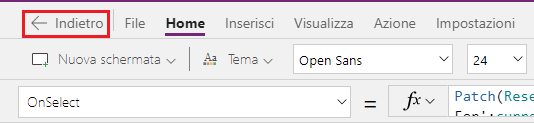 Andare alla barra della formula ed esaminare la formula per OnSelect. Quando l'utente seleziona l'opzione Prenota, viene usata una funzione Patch() per creare una nuova riga Prenotazione. Questa nuova riga ha relazioni con la scrivania e l'utente. La relazione dell'utente viene impostata da una variabile globale stabilita nell'app all'avvio.