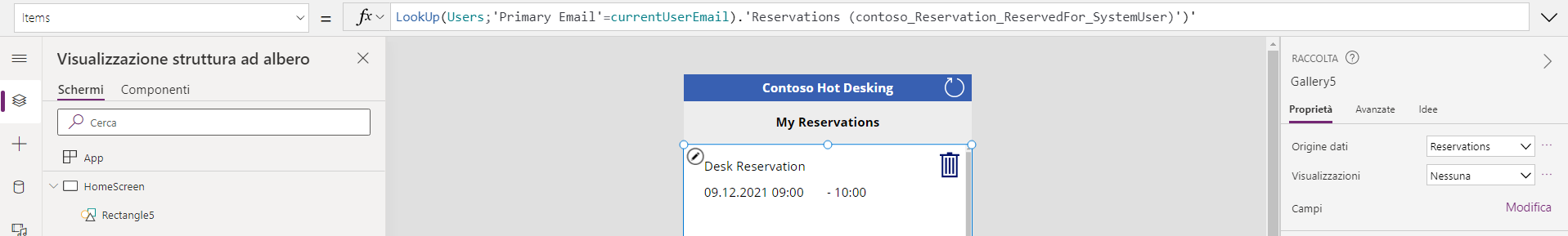 LookUp(Users,'Primary Email'=currentUserEmail).'Reservations (contoso_Reservation_ReservedFor_SystemUser)'Selezionare l'icona Modifica della raccolta.