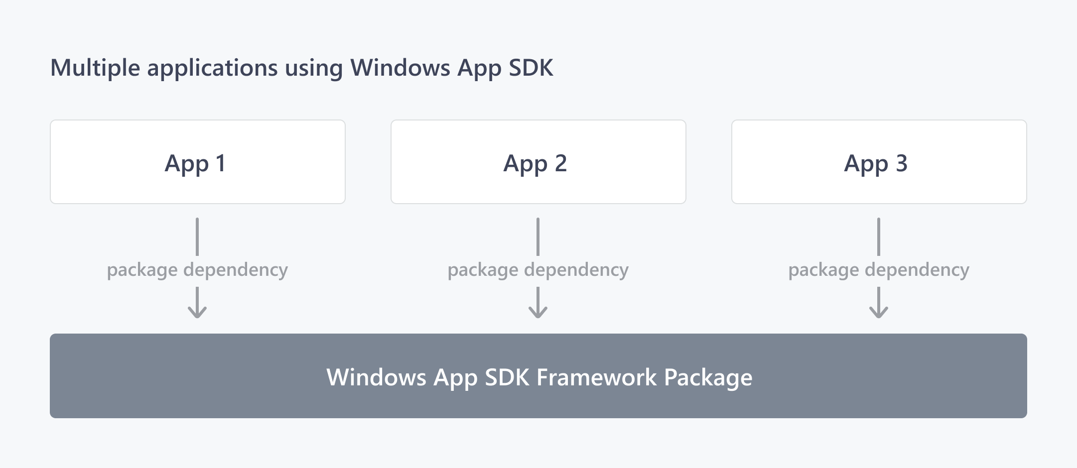 Il pacchetto framework di Windows App SDK è un pacchetto MSIX distribuito agli utenti finali tramite Microsoft Store. Può essere aggiornato facilmente e rapidamente con le versioni di manutenzione, che possono includere correzioni di sicurezza e affidabilità. Tutte le app dipendenti dal framework che usano Windows App SDK hanno una dipendenza da un'istanza condivisa del pacchetto framework, come illustrato nel diagramma seguente.