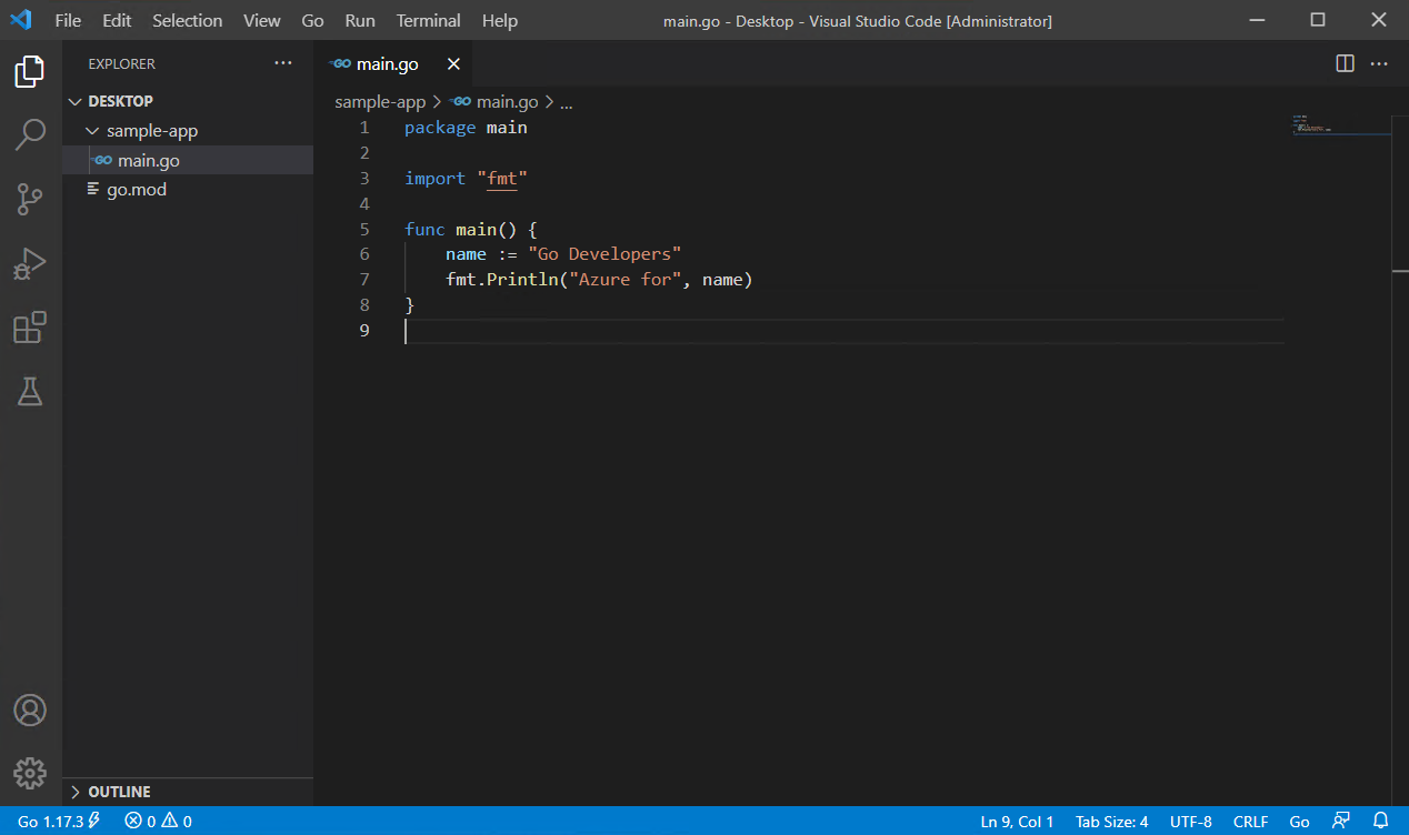 このクイック スタートでは、Go コンパイラとツールをインストールし、Visual Studio Code をインストールして Go コードを記述し、Go の作成中にサポートを提供する Go for Visual Studio Code 拡張機能をインストールします。 構成したら、アプリケーションを作成して実行し、デバッグ ツールを使用して実行を一時停止し、変数の値を観察します。
