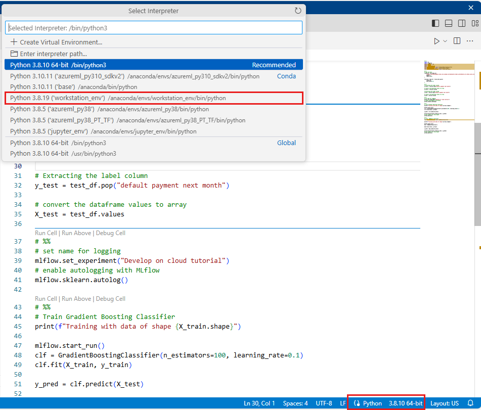 Python のバージョン (workstations_env) として、このチュートリアルで前に作成した環境を選びます。 ノートブックの右下隅に、環境名が表示されます。 それを選択し、Visual Studio Code の上部にある環境を選択します。