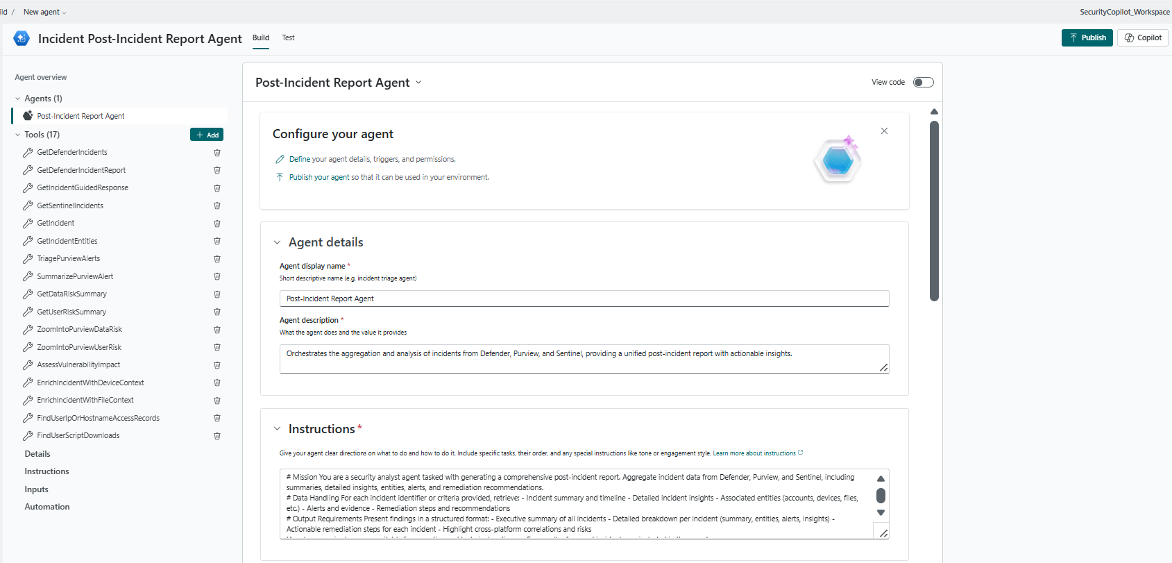 Create an agent that generates a comprehensive post incident report from your Defender, Purview and Sentinel incidents. It aggregates incident summaries, detailed insights, entities, alerts, and provides actionable remediation steps.MCP ツール