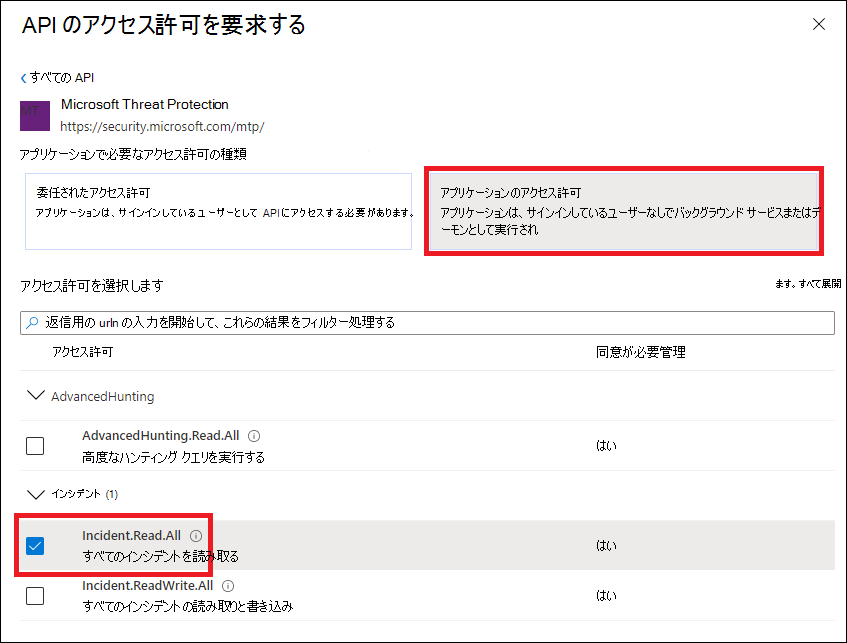 シナリオに関連するアクセス許可を選択する必要があります。 すべてのインシデントの読み取り は単なる例です。 必要なアクセス許可を決定するには、呼び出す API の [アクセス許可] セクションをチェックします。