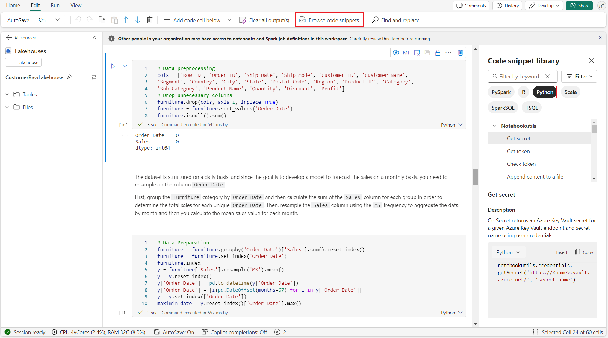 • レイクハウス & リソースがネイティブに使用可能: Fabric レイクハウスとノートブック組み込みリソースのすべての機能が、Python ノートブックで利用できます。 この機能を使用すると、ユーザーはデータを Python ノートブックに簡単に取り込み、ドラッグ & ドロップするだけでコード スニペットを取得できます。