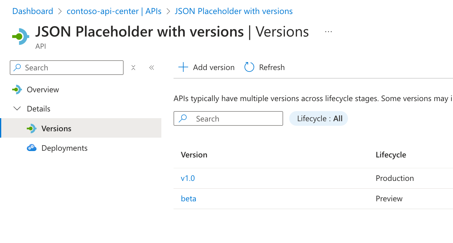 開始する前に、Azure API Center インスタンスを作成し、組織内で使用する API を登録します。 各 API について、使用するバージョンを定義し、ライフサイクル ステージを指定します。
