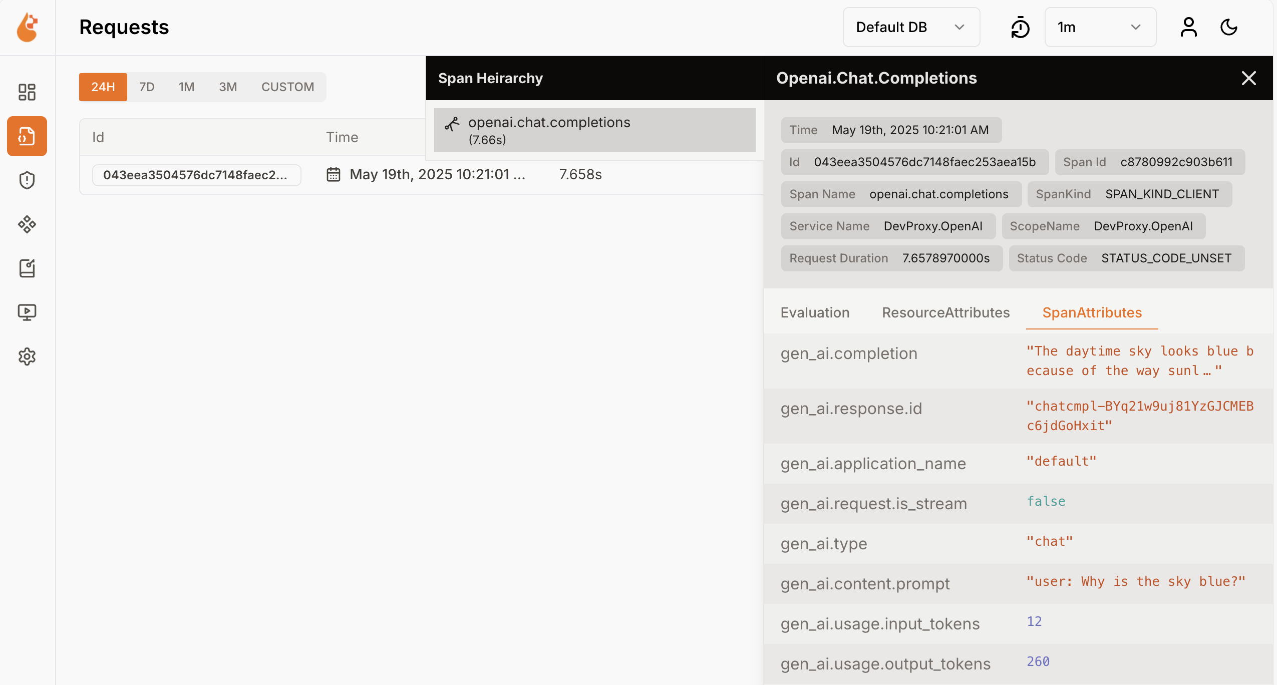 インターセプトするように開発プロキシを構成した OpenAI 互換エンドポイントに要求を行います。