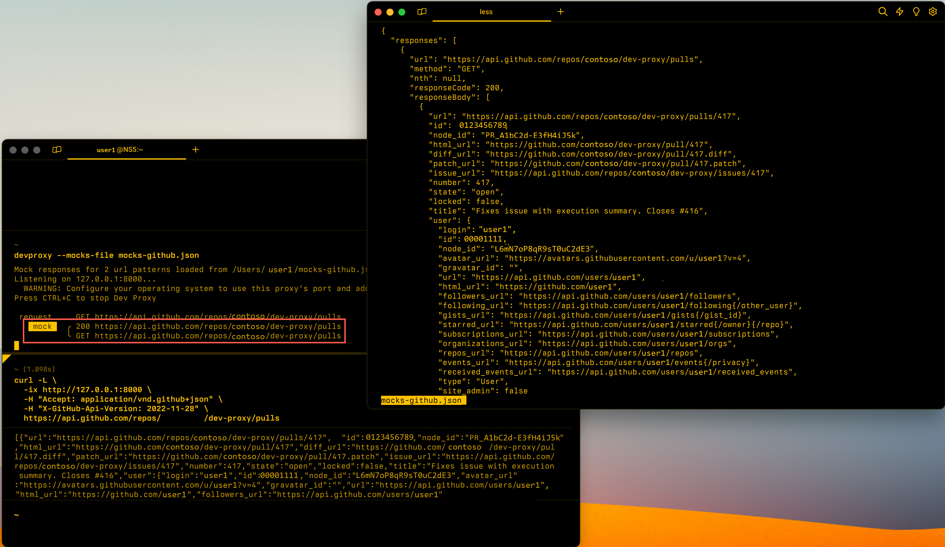 モックを定義するときは、最も具体的なモックを最初に配置します。 たとえば、2 つのモック (1 つは https://jsonplaceholder.typicode.com/posts 用、1 つは https://jsonplaceholder.typicode.com/*用) がある場合は、最初のモックを最初に配置します。 それ以外の場合、開発プロキシは最初に 2 番目のモックと一致し、すべての要求に対する https://jsonplaceholder.typicode.com/* の応答を返します。