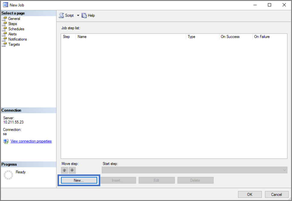ジョブの名前を指定し、ジョブ ステップを作成します。