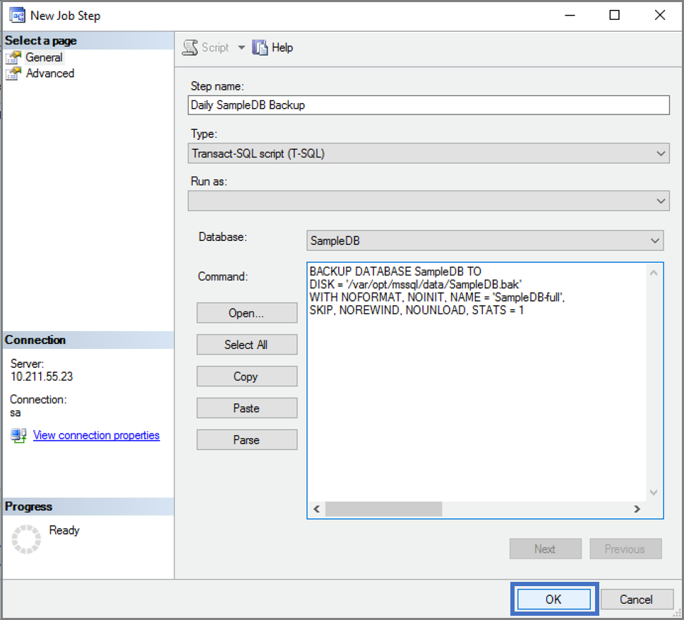 Daily SampleDB Backupという名前のジョブを作成します。-- Adds a new job executed by the SQLServerAgent service -- called 'Daily SampleDB Backup' USE msdb; GO EXECUTE dbo.sp_add_job @job_name = N'Daily SampleDB Backup'; GOsp_add_jobstep を呼び出して、