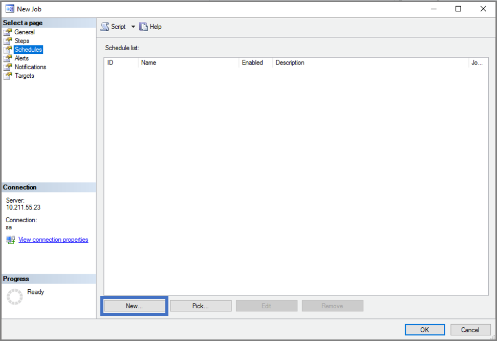 -- Sets the 'Daily' schedule to the 'Daily SampleDB Backup' Job EXECUTE sp_attach_schedule @job_name = N'Daily SampleDB Backup', @schedule_name = N'Daily SampleDB'; GOsp_add_jobserver を使用して、対象サーバーにジョブを割り当てます。 この例では、ターゲットはローカル サーバーです。