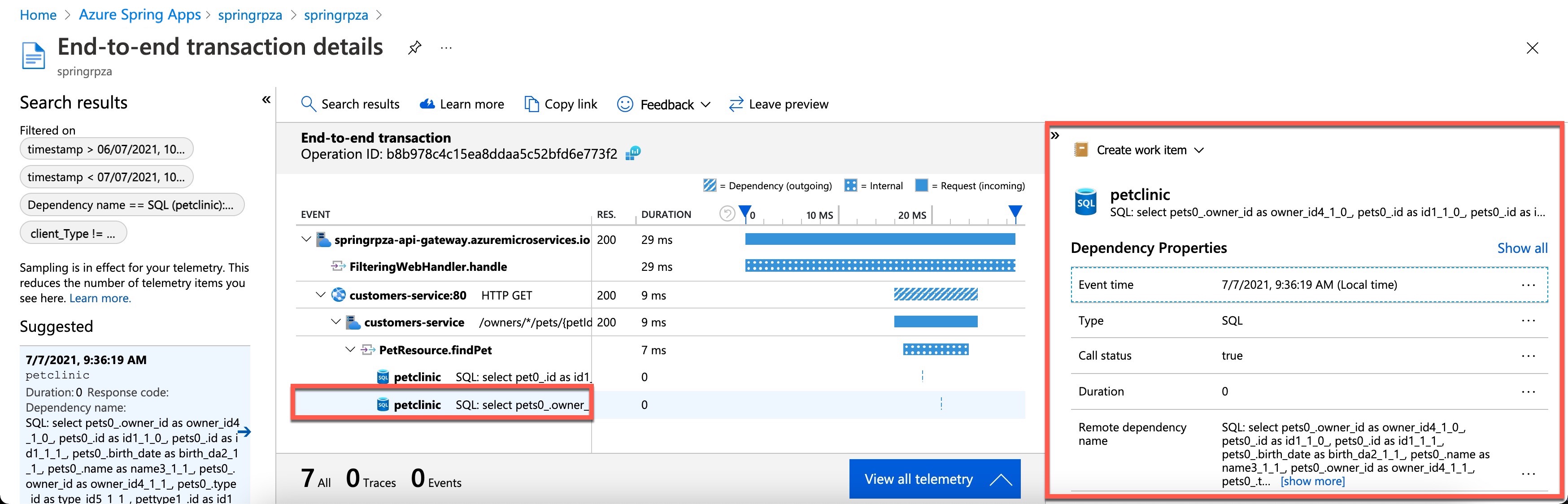 次に、右側のタブで [ ドリルイン] を選択し、右端のタブで SQL サンプルを選択してトランザクションの詳細ウィンドウを開きます。